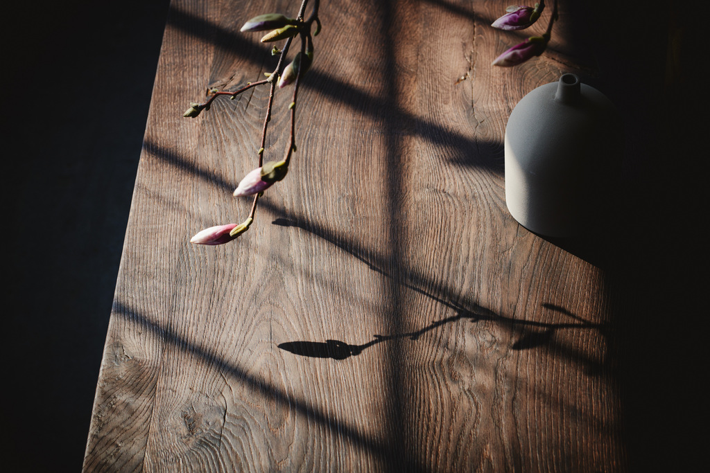 Weil er in seiner Einzigartigkeit eine Geschichte mitbringt und als individuelle Aufbereitung lebendigen Materials zum Zentrum eines Wohnraums wird. Der Tisch trägt die Kraft, die der Natur innewohnt, zu den Menschen – die sich letztlich ja nach dieser Ursprünglichkeit sehnen.