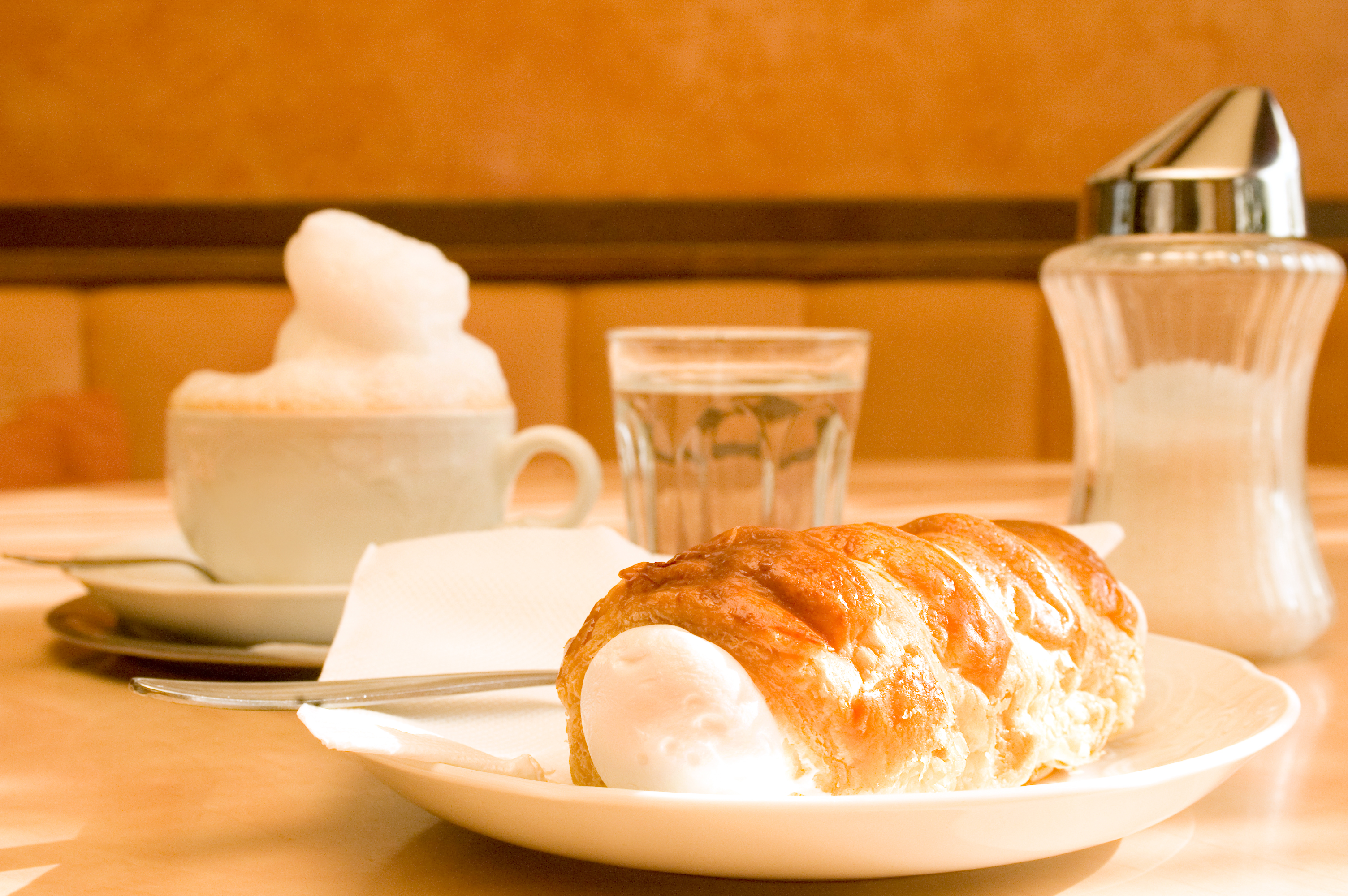 Der aufwändig hergestellte Blätterteig wird um eine Formrolle gewickelt knusprig gebacken und mit Eischnee, Schlagobers, Vanille- oder Schokocreme gefüllt.
