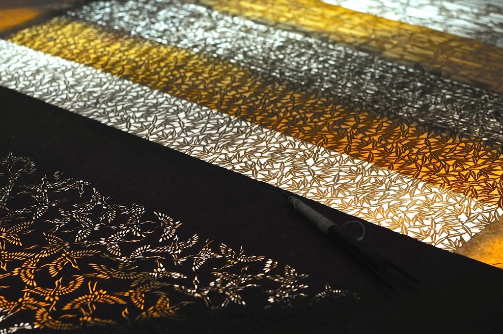 Nishimura Yuzen Chokoku engraves paper patterns to make various traditional Japanese clothing and accessories. Depending on the method of dyeing or the usage of the clothing, sometimes it is necessary to make a few to several to hundreds of paper patterns for clothing. All the products are made with those patterns with care.