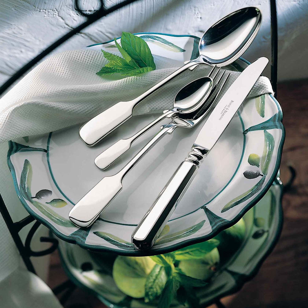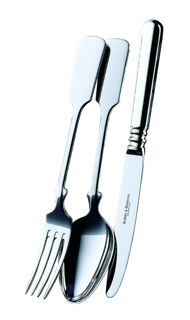 Die historischen Merkmale dieses Besteckmusters sind die stark ausgeprägte "Ohren" und der fast waagerecht verlaufende, langgezogene "Spaten". Durch seine Schlichtheit und Eleganz paßt es zu vielen klassischen und auch modernen Porzellanformen.