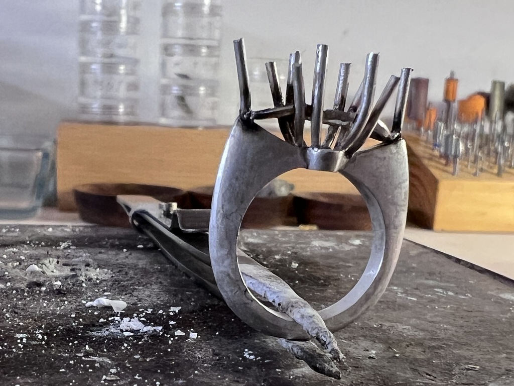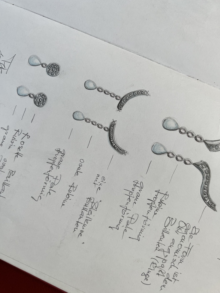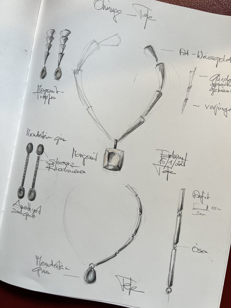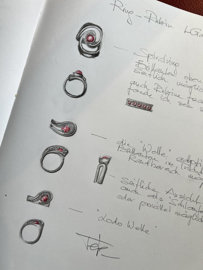 Im Atelier wird erzählt, gehört, gefühlt, maßgefertigt. Es werden die geheimen Wünsche der Kunden:Innen aufgespürt, um jedem Schmuckstück seine Einzigartigkeit zu geben und "neugedachte Lieblingsstücke" zu kreieren.