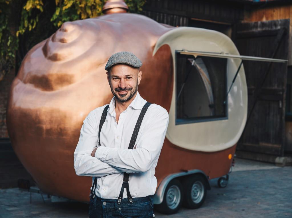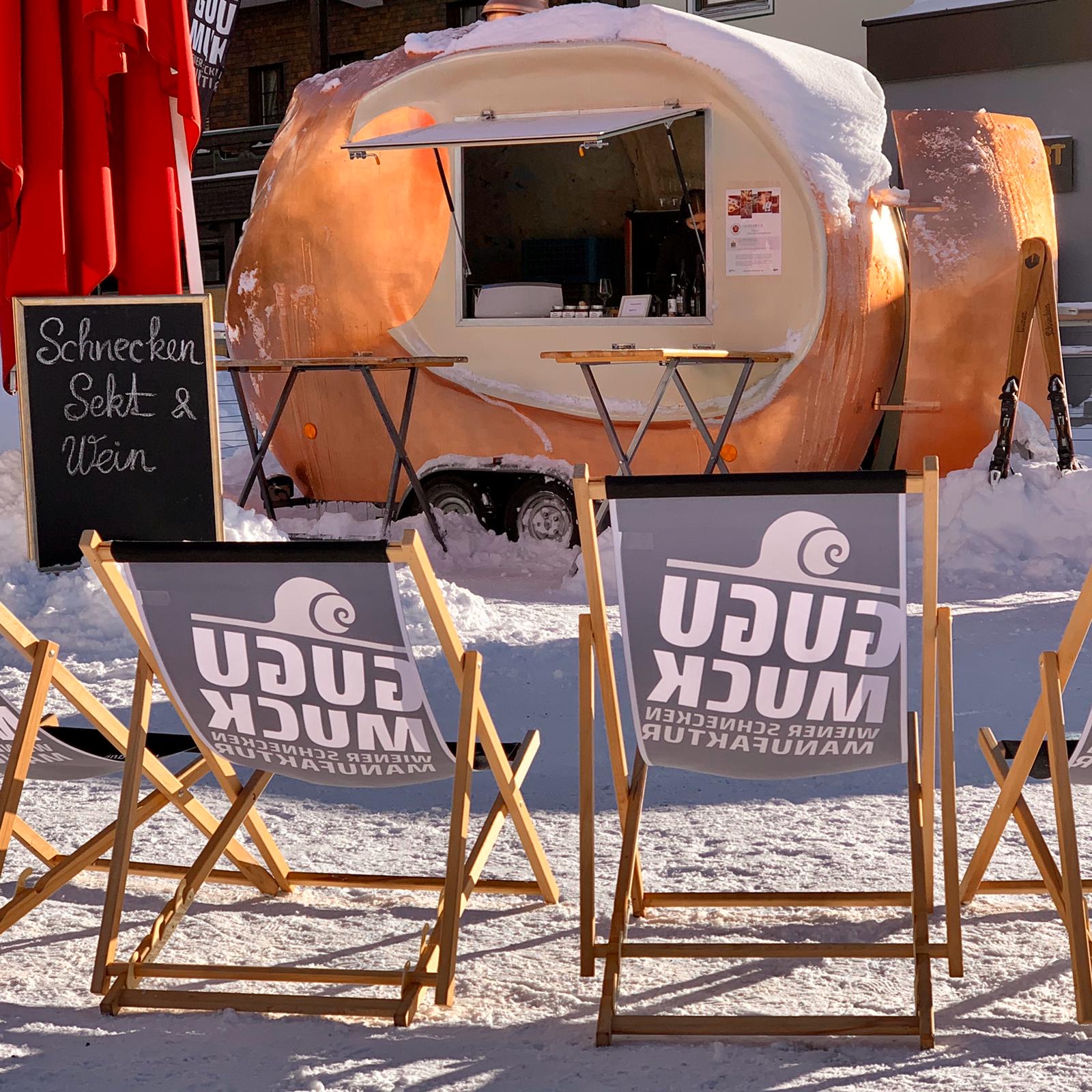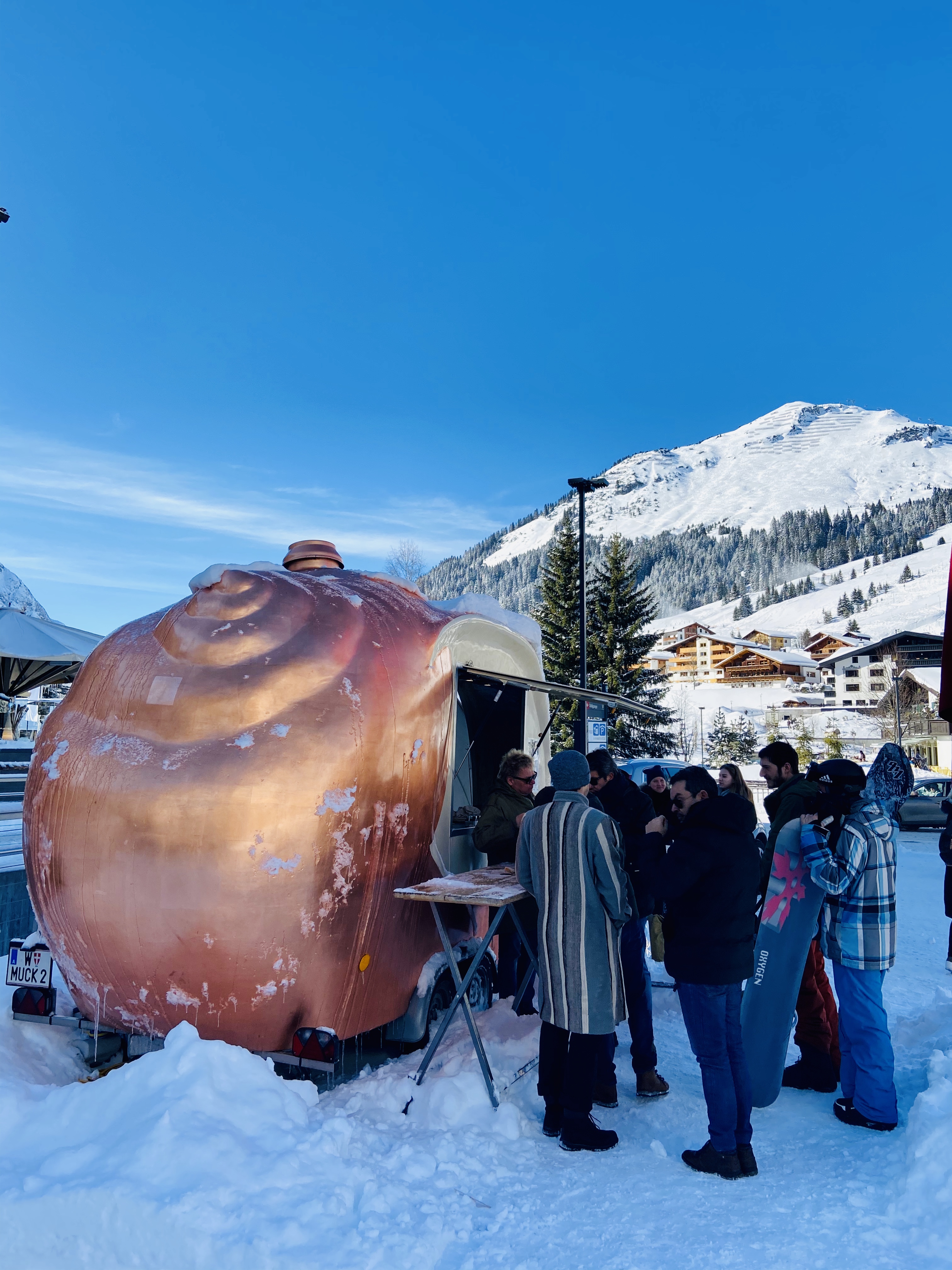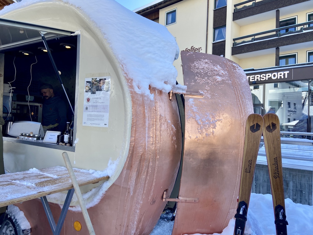 Direkt im Zentrum von Lech gastiert Andreas Gugumuck mit seinem Food-Truck in Schneckenform aus echtem Kupfer.