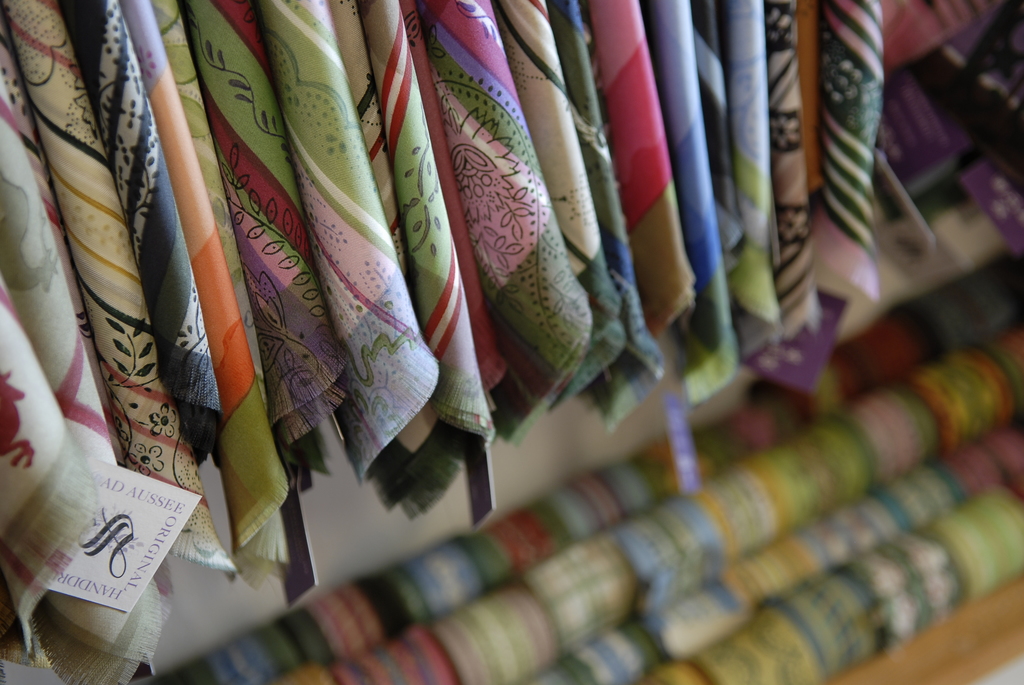 Handdrucktücher, Stoffe aus Seide und Baumwolle, Dirndlstoffe, Anfertigung von Tischwäsche und Vorhängen, Trachtenaccessoires, Krawatten