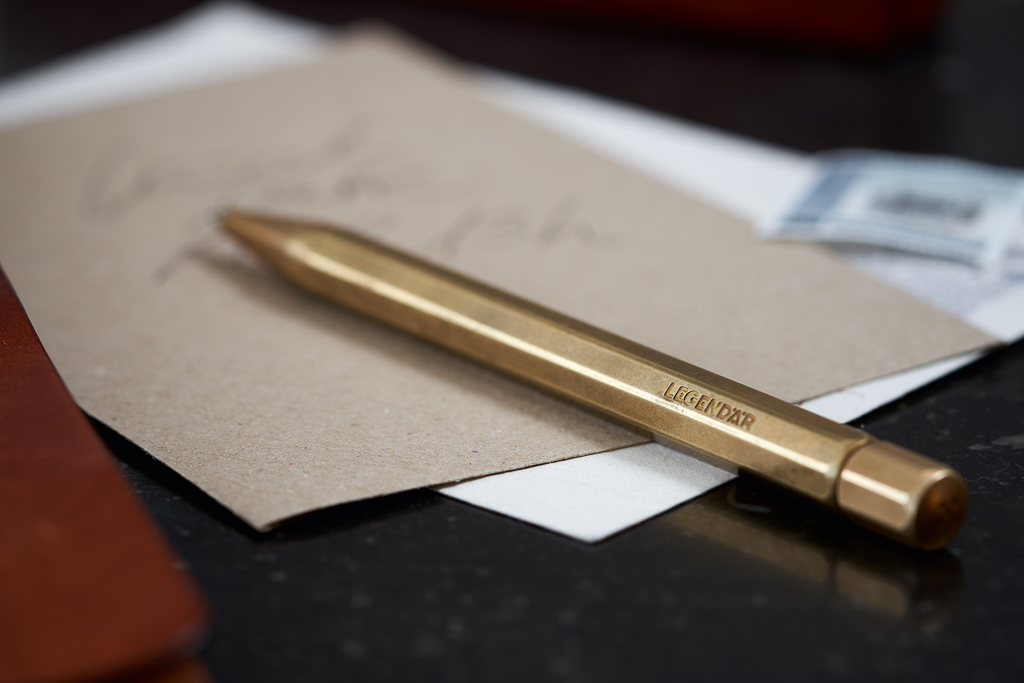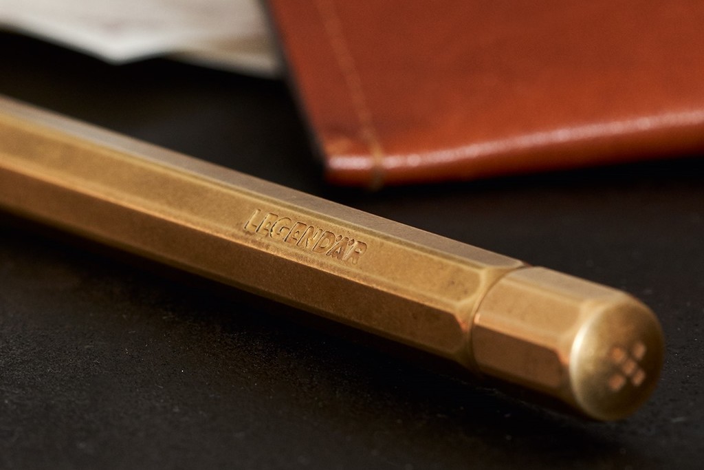 Jedes Schreibgerät besteht aus drei Messingteilen. Schaft und Kappe der Schreibgeräte werden in einem aufwändigen Ätzverfahren mit dem LEGENDÄR Schriftzug und dem charakteristischen LGNDR Signet versehen. Mit der Benutzung bildet sich die typische Messingpatina, die den 38 Gramm schweren Schreibgeräten ihr authentisches Aussehen verleiht.