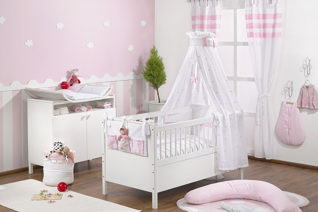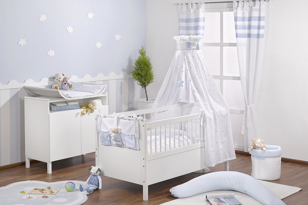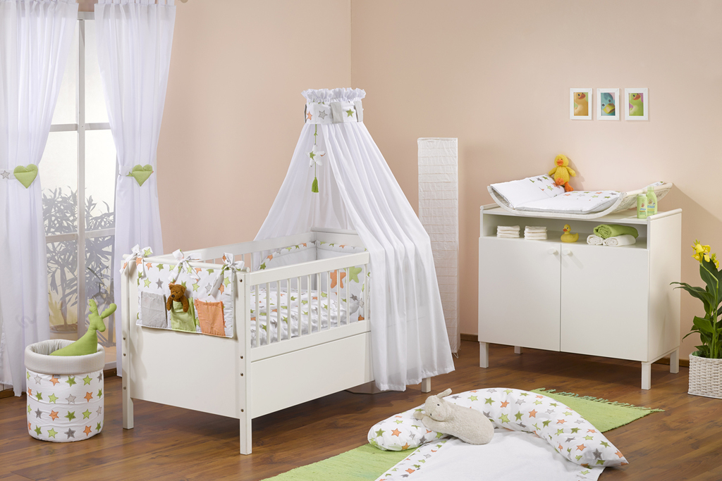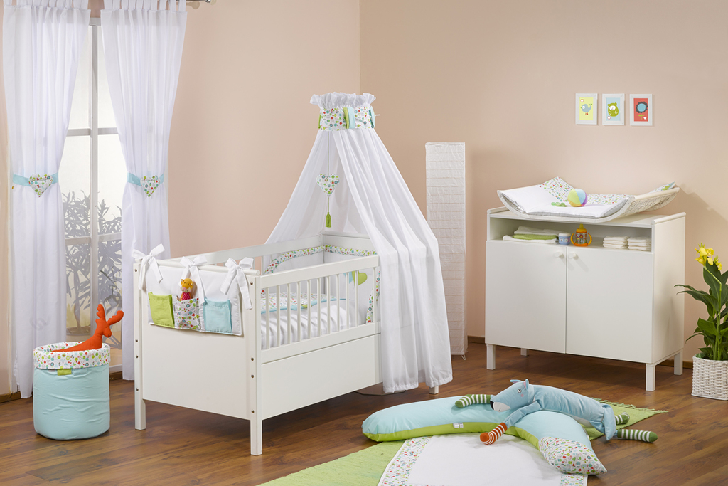 • Ausstattung von Kinderzimmern mit Tapeten, Teppichen, Vorhängen, Bett-Sets, Schlafsäckchen, Wickelauflagen, Stillkissen, Toyboxen, Utensilienbags und Decken.