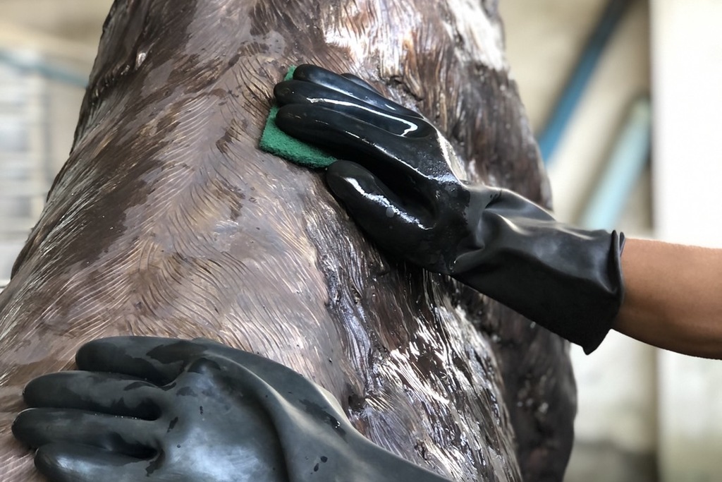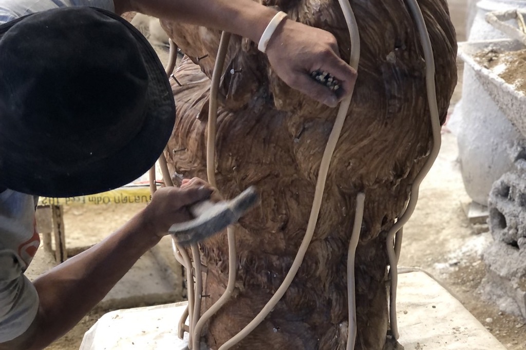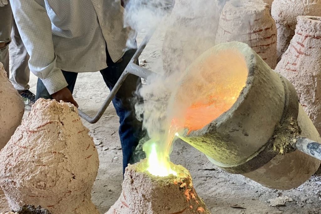 First step is sculptor, the sculpture sculpt our desired design on wax. Sculptor has to know their crafts especially for pieces that require great details. Caster, molten wax are used to brush over the silicon for it to take the shape of the mould. These has to be the precise thickness, not to thin because we would not be able to work on the details and not too thick because it would be too heavy. Pouring of the brass. Our foundry has 2 heavy duty melting furnace, these furnaces need to be able to withdraw temperature up to 1000c in order to molten the brass and big enough for us to liquify 3-5 tons of brass per casting session. Before pouring the molten brass into the prepared casting we have to make sure that the wax, cement is completely dried or else it may explode. Another expertise needed for our foundry that is crucial in our production line is welding, we cast pieces in sections and each section would have to be welded together to make a piece. The welder needs know where to weld and have to weld it enough to make sure the piece is sturdy.