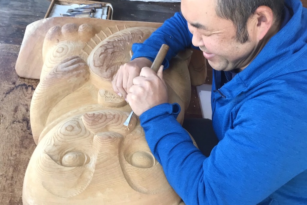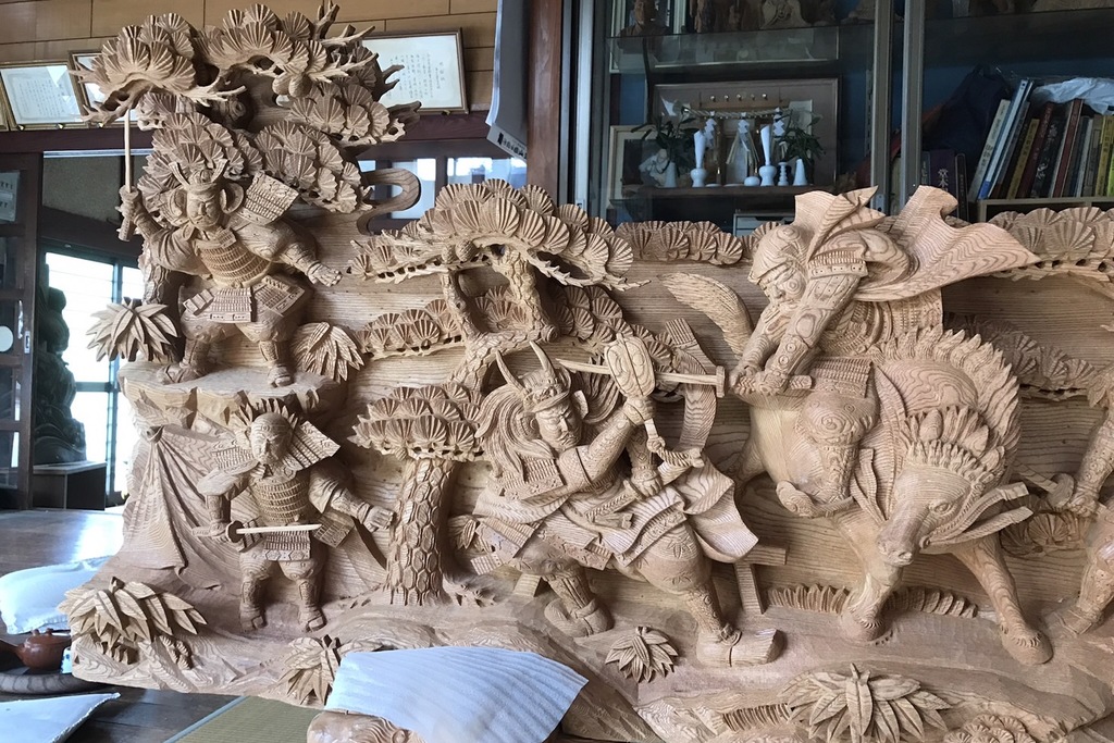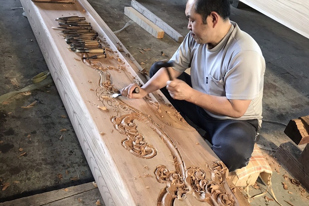 Suiun carvings are often full of realistic three-dimensionality, and we can carve a variety of works from carvings of shrines and temples, festivals portable shrines, to detailed carvings such as Buddhist altars and traditional balustrades (ranma). Suiun carving is characterized by its ability to carve a variety of works.