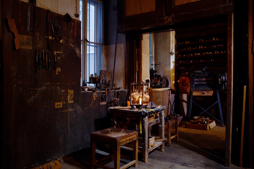 Der Besucher der SCHEER Welt taucht in die Geräuschkulisse einer Werkstatt ein, wo mit historischen Werkzeugen und rein von Hand maßgefertigt wird. Das Lederlager, dessen Vorräte als großer Schatz des Unternehmens gehandelt werden, verzaubert mit so manchen Raritäten und duften Eindrücken.