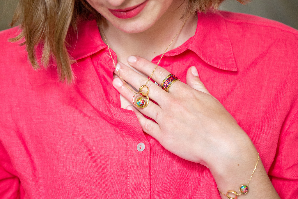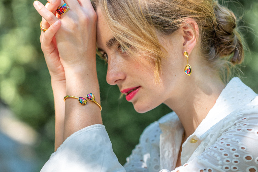 Bis zu 100 manuelle Arbeitsschritte sind zur Herstellung des fertigen filigranen, farbintensiven Feueremailplättchen notwendig, das anschließend in die jeweilige Fassung eingesetzt wird.