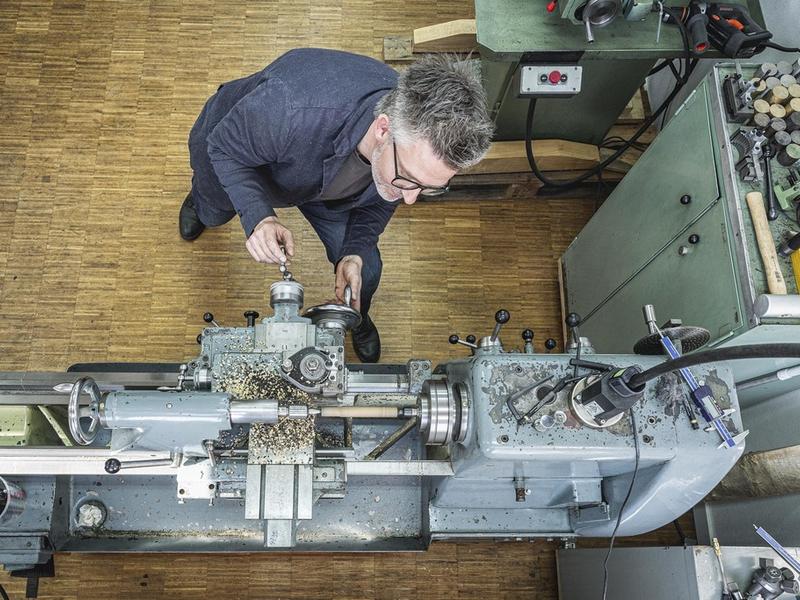 Die Maschinen in der Atelier-Werkstatt sind präzise, alt und mechanisch analog. Sie werden von Hand gesteuert - nicht digital. Frank Pressentin arbeitet grundsätzlich aus dem vollen Material und gestaltet direkt auf der laufenden Drehbank. Emotionen übertragen sich über die Hand auf's Werk – wie bei einem Bildhauer. Dies garantiert, dass kein Stück je wirklich gleich ist. Nach seinem Verständnis ist das der einzige Weg zu echten Unikaten.