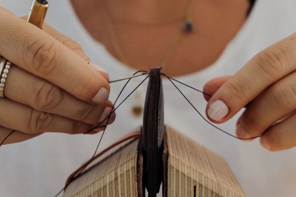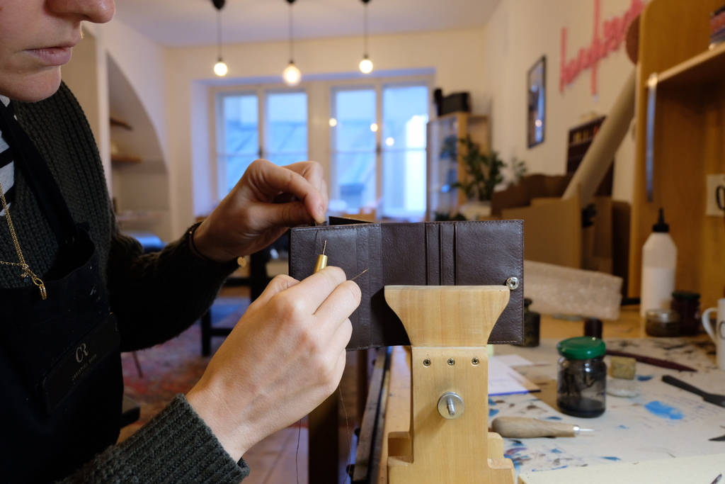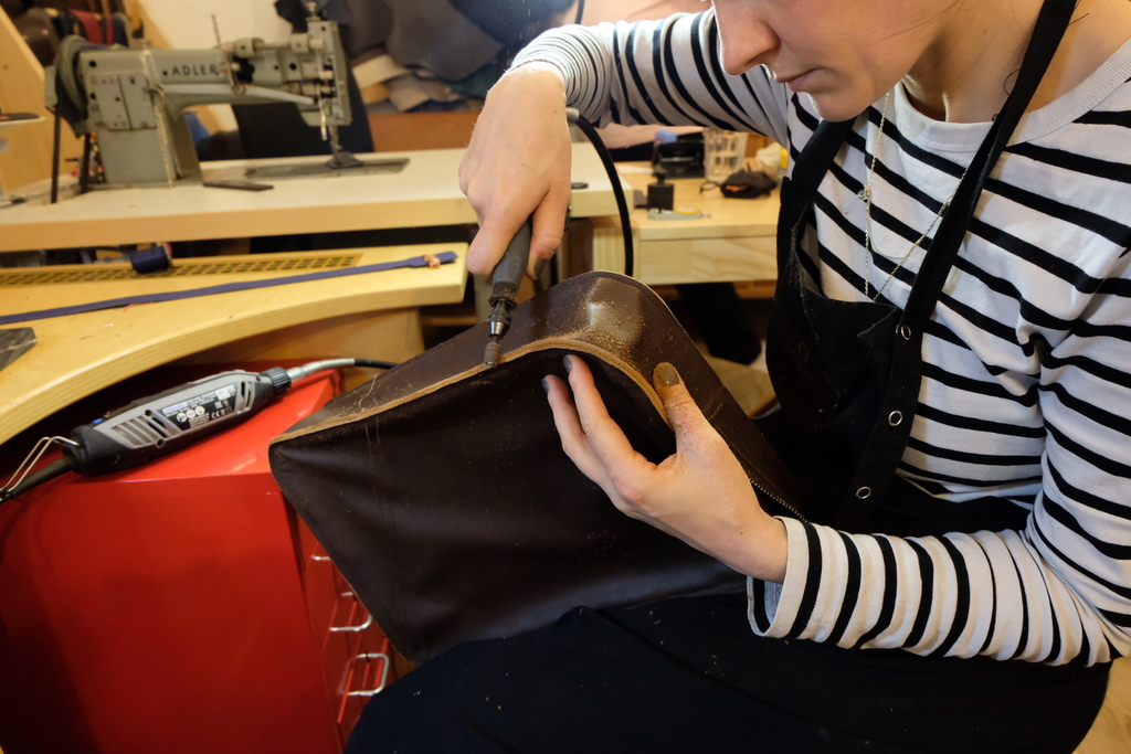 Die perfekte Sattlernaht ist eine Kunst. Jeder Faden wird von Hand mit Bienenwachs gewachst und mit Feuer veredelt. Als Autoditakt eignete sich Christina Roth ursprüngliche Techniken an, die ihr erlauben, nahezu ohne Hilfe von Maschinen langlebige Lederwaren herzustellen. Kanten, die ein Produkt perfekt rahmen sollen, bearbeitet sie voller Leidenschaft für jeden Handgriff mit bis zu 20 Arbeitsschritten.