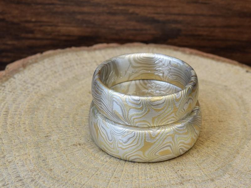 Für jedes Schmuckstück und jedes Trauringpaar erstellen wir in der Regel ganz spezielle individuelle Schichtungen mit den ausgewählten Lieblingsfarben. Dadurch entstehen - je nach Anordnung der Schichten und der Weiterverarbeitung - immer wieder neue, persönliche Einzelstücke. Die gewünschten Muster können wir vorab schon ziemlich genau planen. Aber trotzdem: bei dem langen Weg der Herstellung in dieser aufwändigen Schmiedetechnik, der ständigen Verformung und Umwälzung der Edelmetalle und deren unterschiedlicher Eigenschaften in den Schichten des Blocks kann man halt doch nicht hundert prozentig genau das Endresultat bestimmen. Und genau das macht den Reiz dieser japanischen Schmiedekunst aus.