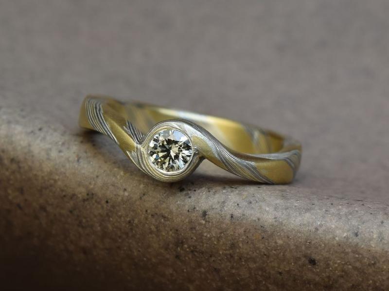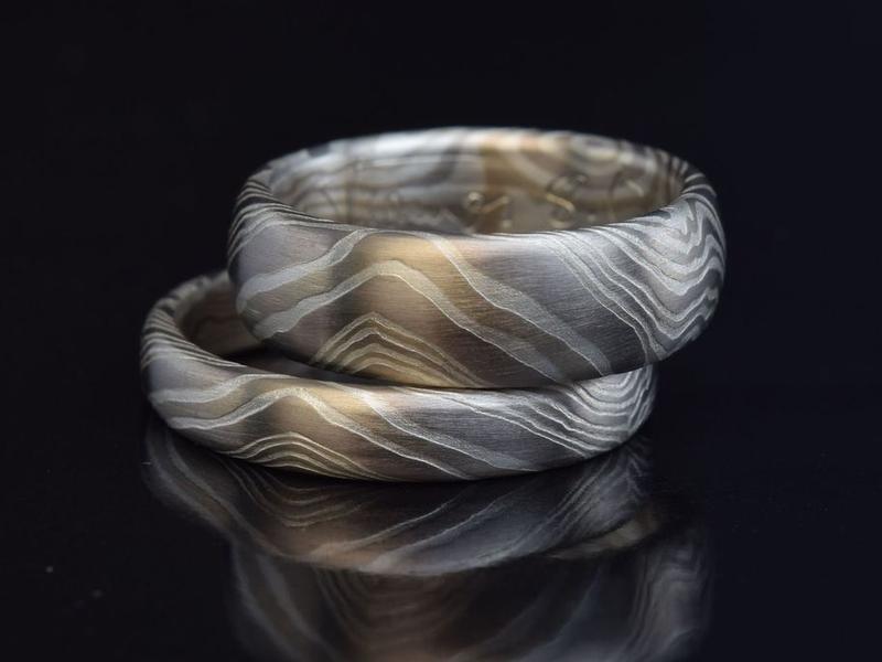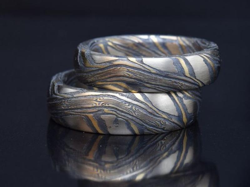 in den unterschiedlichsten Edelmetall-Farben. Seit vielen Jahren sind wir auf diese anspruchsvolle Schmiedetechnik spezialisiert und schmieden in unserer Werkstatt individuelle Mokume Gane Trauringe und Schmuckunikate in Perfektion.